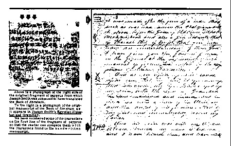 All of the characters in the first two rows on the papyrus fragment shown in illustration No. 1 can be found attached to the portion of the Book of Abraham in Joseph Smith's "Egyptian Alphabet and Grammar." Illustration No. 3 provides a comparison of characters from one of the handwritten manuscripts with the characters as they appear on the original papyrus.