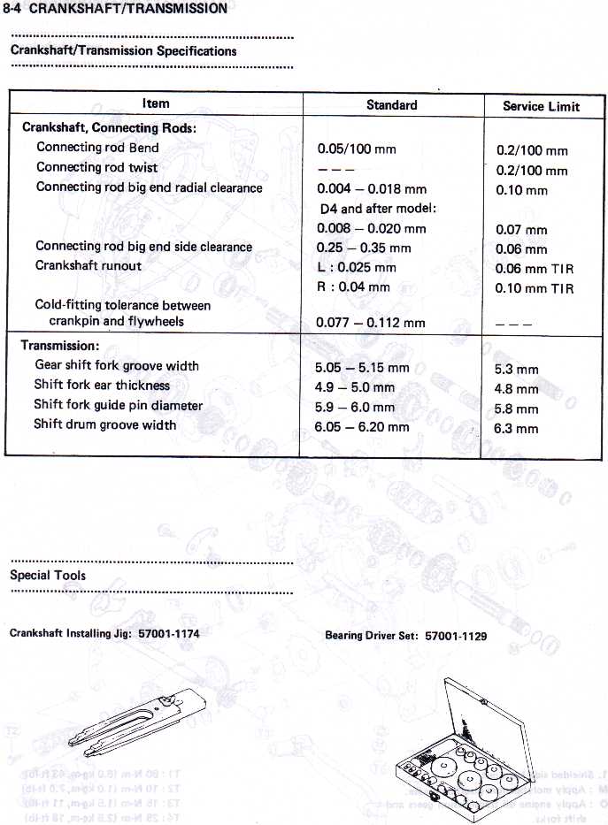 | I promplty got both, the base and supplemental service manuals, as well as the owners manual. The base manual covers 1984 KLR 600 U.S. and European models (It doesn't say what else it covers though? It's what the dealer pulled for my 1990 KLR250.) The supplimental manual covers 1985 - 1997 years, and models KL250-D2 to KL250-D14. These manuals are not as good as my Haynes manuals, but are good enough to follow. I'd say they're meant more for a technician. | |