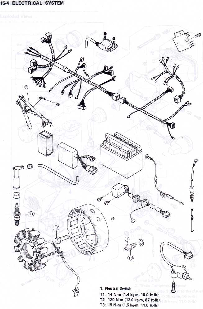 I quickly changed the oil & filter, coolant system, air filter, and the spark plug. Opened the carbeurater drain and drained out any dirt and water. Synthetic oil and pre-mixed coolant helped get the bike ready for the winter driving at low temperatures. The chain was fairly dirty, so a good cleaning left it shiny new again - rolls much better! This maintenance log is more to remind me when and what needs to be done. The following pictures are for 1985 - 1997 years, and models KL250-D2 to KL250-D14 ONLY! Here are the Piston specs, the Valve specs, and the oil filter change instructions from the supplemental manual (KLR250s.) These pictures are exploded views of the crankshaft - View 1 and View 2. Here are the crankshaft specs. How 'bout exploded views of the engine top end including the cylinder head and valves Exploded view of the battery electric connections | |