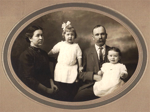 Family of Mae (Slonecker) Figard, daughter of Adah Whitnah and James Slonecker. Left to Right: Mae Figard, Amy Louise Figard, Henry Figard, Edith Figard.