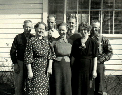 Left to Right, Back Row:Marshall Whitnah, Harvey Whitnah, Sherman Whitnah, Lloyd (Duke) Whitnah.Front:Edna Sadler, Alta Whitnah, Ruby Whitnah.Taken in Rupert Idaho, 1938.