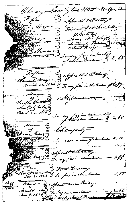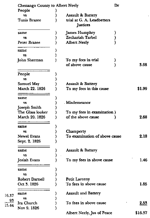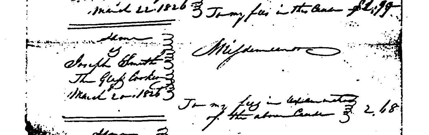 Close up of Albert Neely's handwritten bill listing the Examination of Joseph Smith on 20 March 1826.