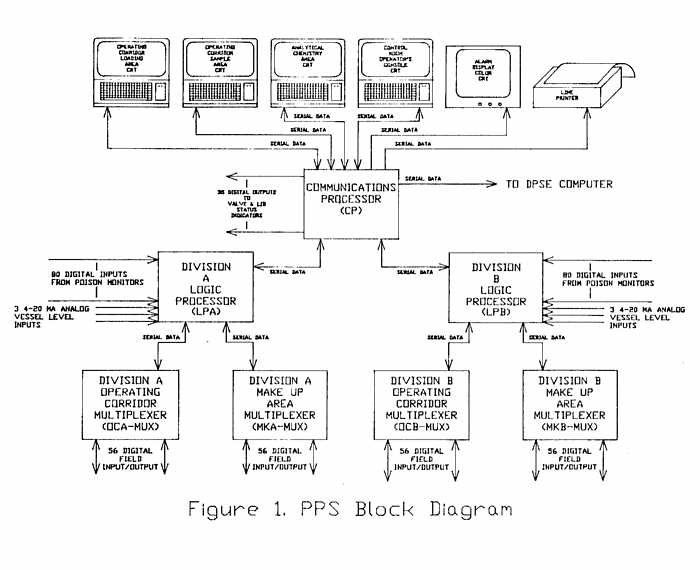 The PPS is divided into two redundant subsystems, Divisions A and B, both of which are connected to a single common subsystem as shown in Figure 1. Each division contains two Multiplexers (MUX's) and a Logic Processor (LP). The two MUX's are connected to the LP, and along with the LP provide the interface to the process. Both of the division LP's are connected to the Communication Processor (the single common subsystem). The Communication Processor (CP) provides the operator interface to the PPS and sends data to the Data Processing System Enhanced (DPSE) main FDP process control computer.